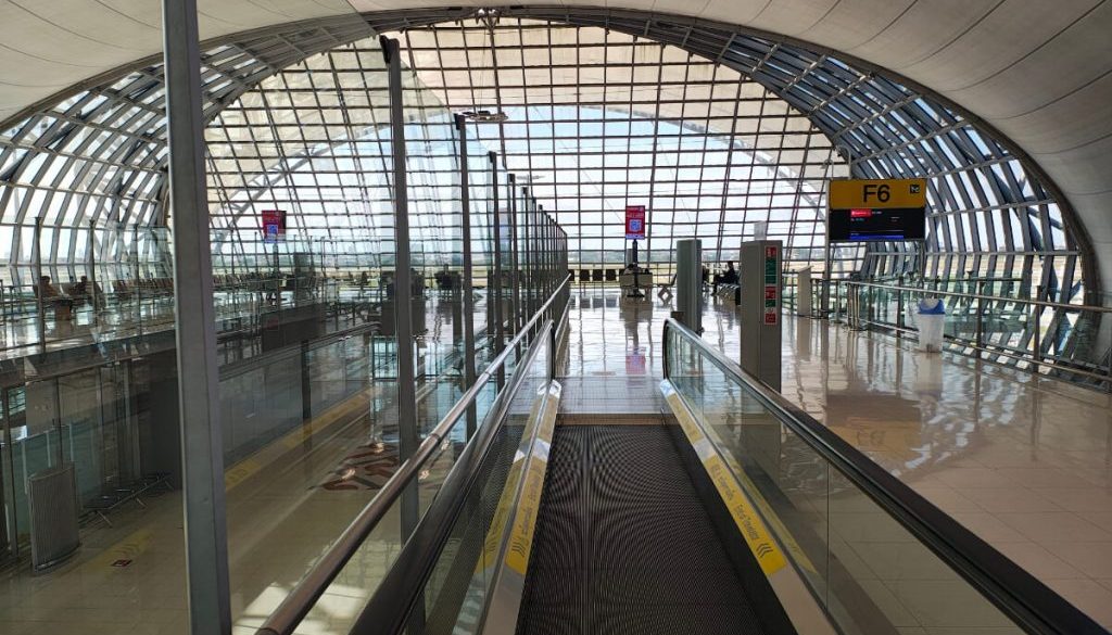 チケットチェックを通過してエスカレーターを上がるとセキュリティチェック。スムーズにどんどん進む。終わったらエスカレータで階下に下がり、出国審査。これが驚き、日本と全く同じ。パスポートをスキャンして顔認証して出国。