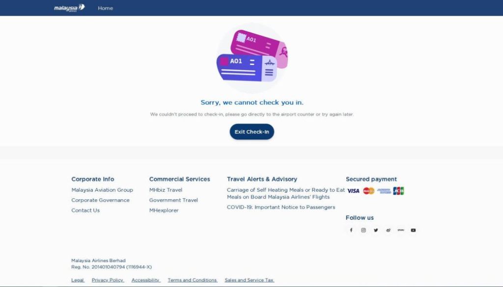 チェックインに進むことができませんでした。空港のカウンターに直接行くか、後でもう一度やり直してください。